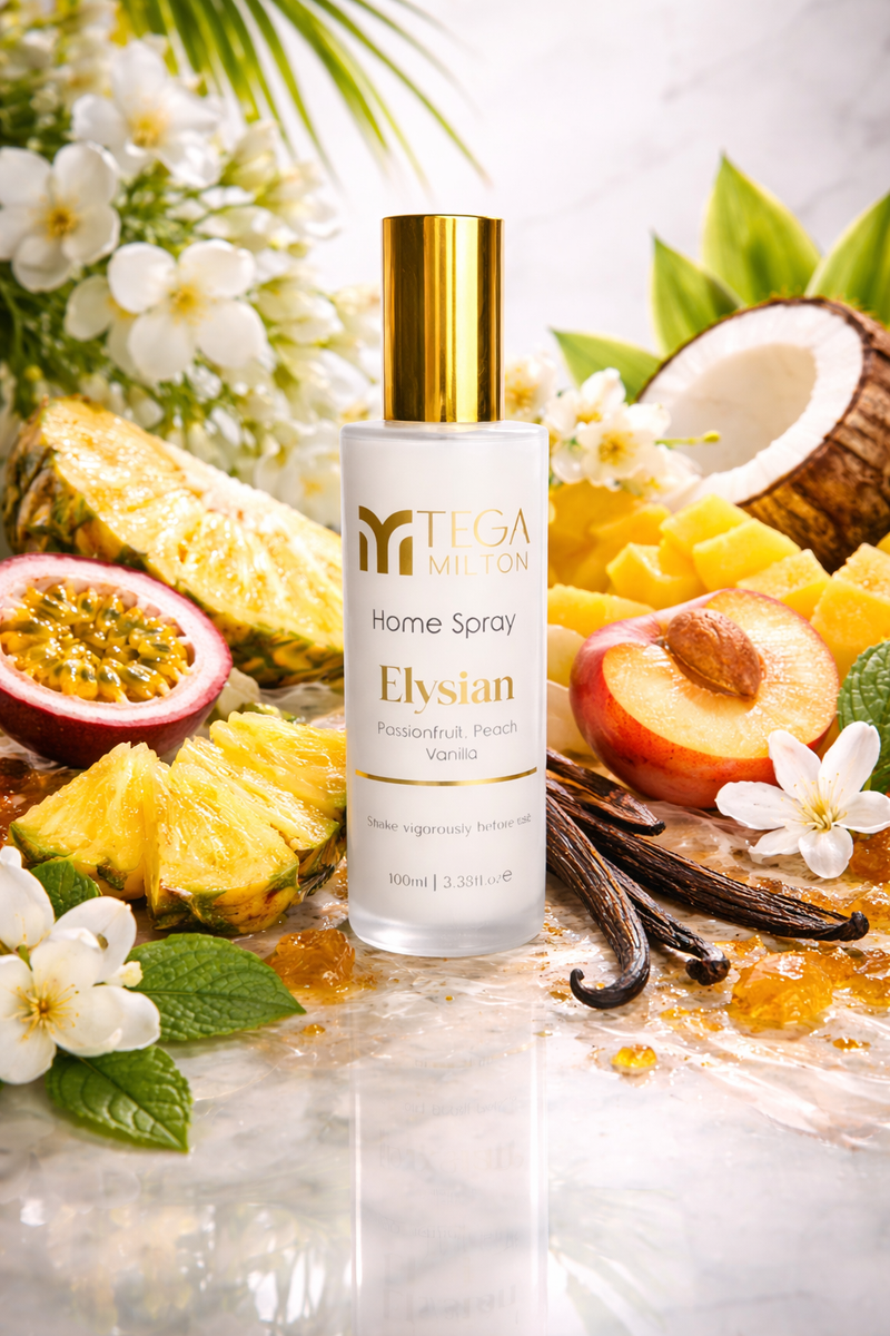 Elysian blends tropical pineapple, peach, and tangy grapefruit with the creamy warmth of vanilla, amaretto, and musk. Layered with passionfruit, mango, coconut, and a whisper of smoke, it creates a balanced, sophisticated fragrance. Soft yet impactful, this spray makes every moment feel indulgent.