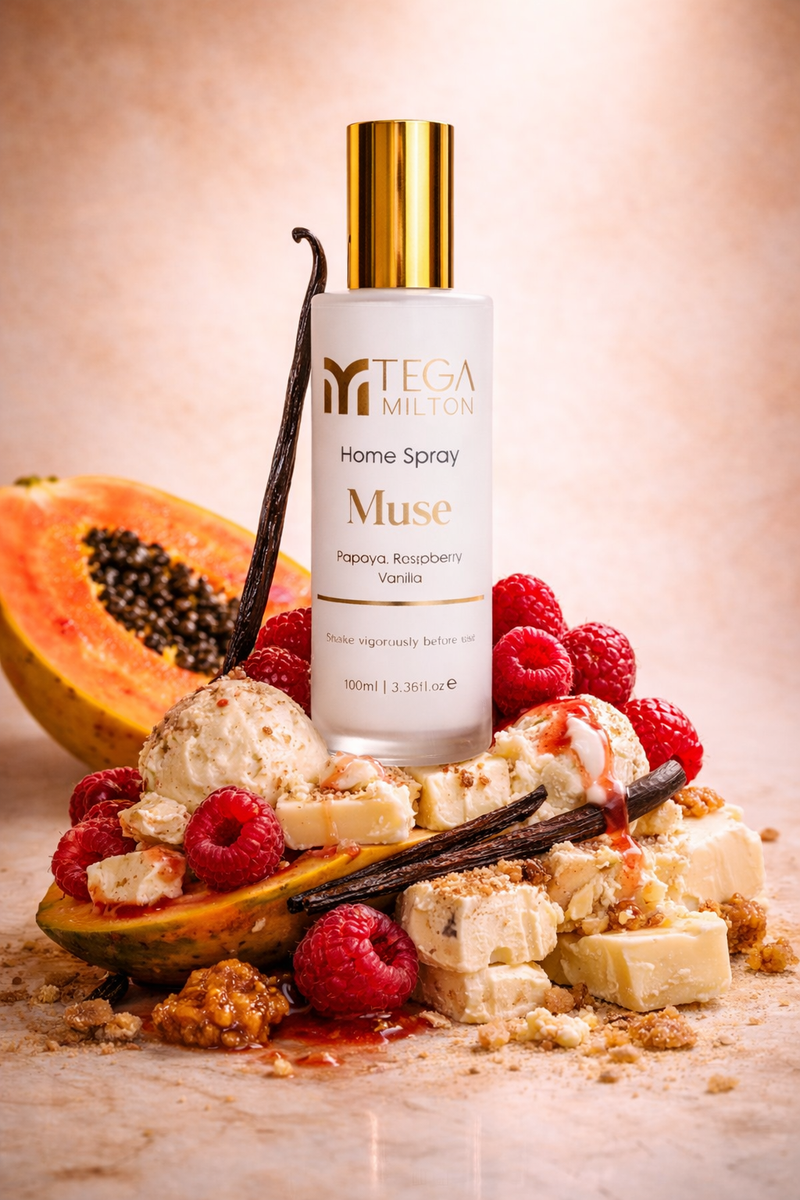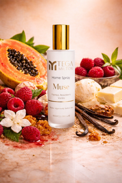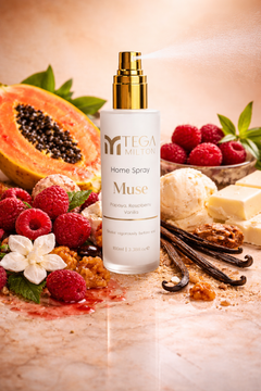 This luxury home spray blends the tropical sweetness of papaya and crème de cassis with the tangy brightness of rhubarb and raspberry. A creamy base of vanilla and white woods smooths everything into a soft, sophisticated finish. Muse is playful yet elegant, perfect for filling your living room, bedroom, or any space you want to feel inspired and uplifted.